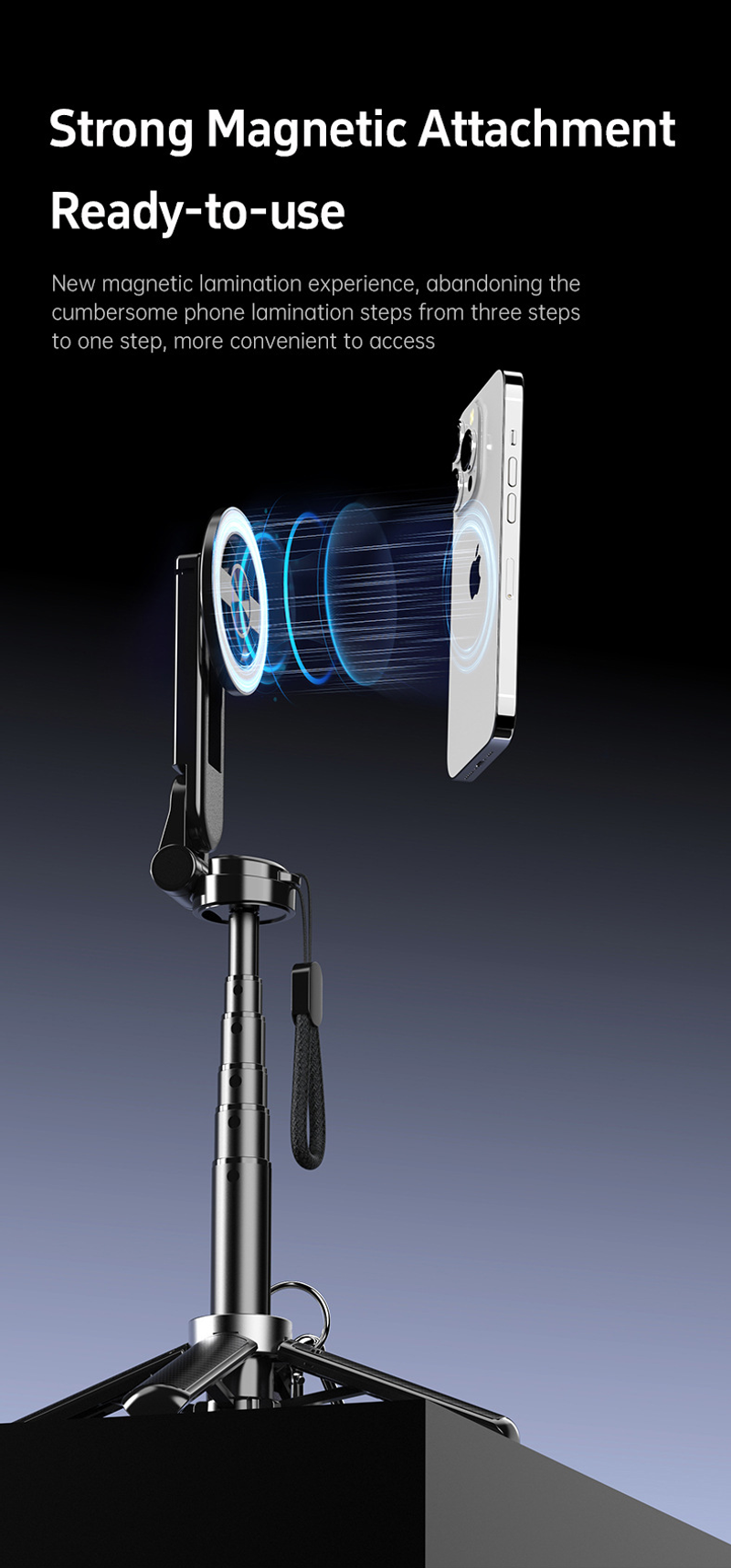 【4-in-1 Magnetic Tripod】 stands out with its strong magnetic design, functioning as a grip handle, desktop stand, and selfie stick all in one. Its versatility makes it perfect for travel, vlogging, conferences, live streaming, and photography, providing convenience, stability, and fun to your shooting experience