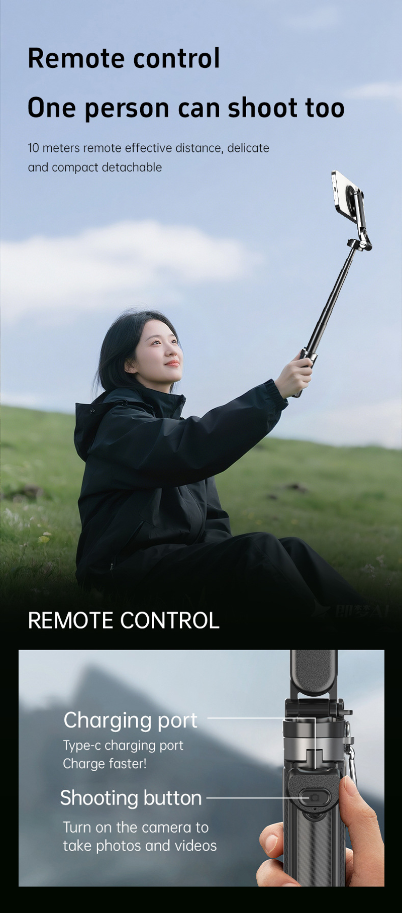 【Bayonet Remote Holder & 10-Meter Range】Unlike typical selfie sticks, the includes a smart bayonet design for the remote shutter, letting you attach or store it conveniently.The wireless remote works within a 10-meter range, allowing you to take great photos solo with just one click