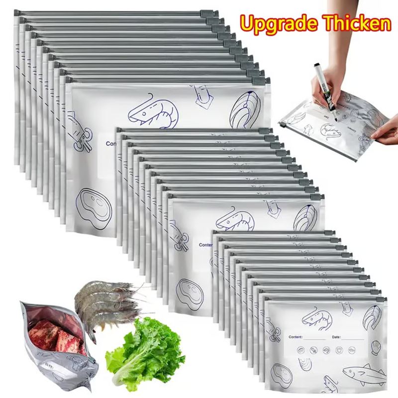 (30pcs )Reusable Aluminum Foil Sealable Storage Bags, 2025 New Resealable Vacuum Zipper Pouches for Food, Stand Up Foil Sealable Bags with Label and Zip Lock for Vegetable Fruit Meat